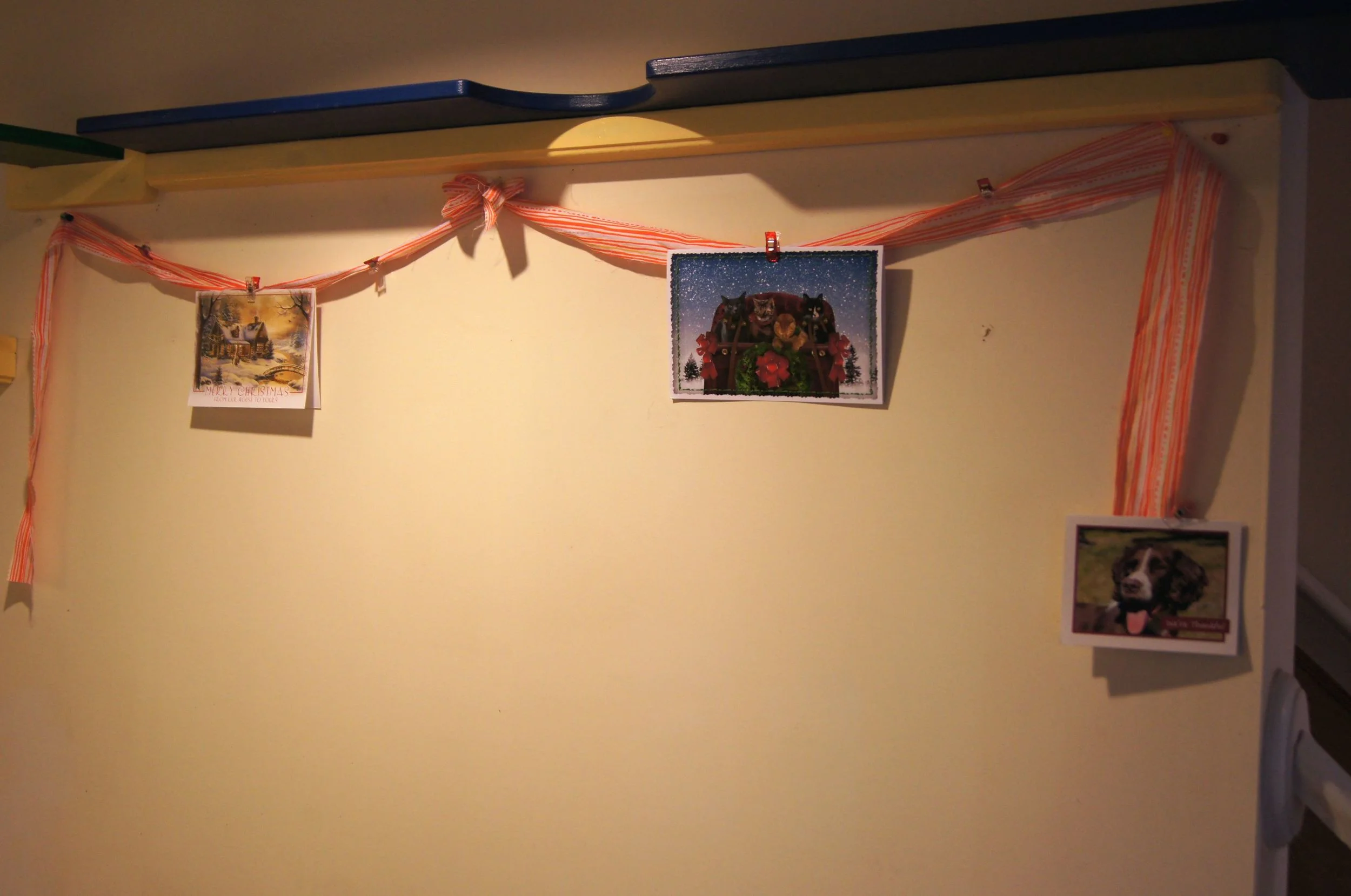 Scrappy Holiday Swag with Greeting cards. (The wooden structure at the top of the photo is the cat walk my brother build for the cats)!
