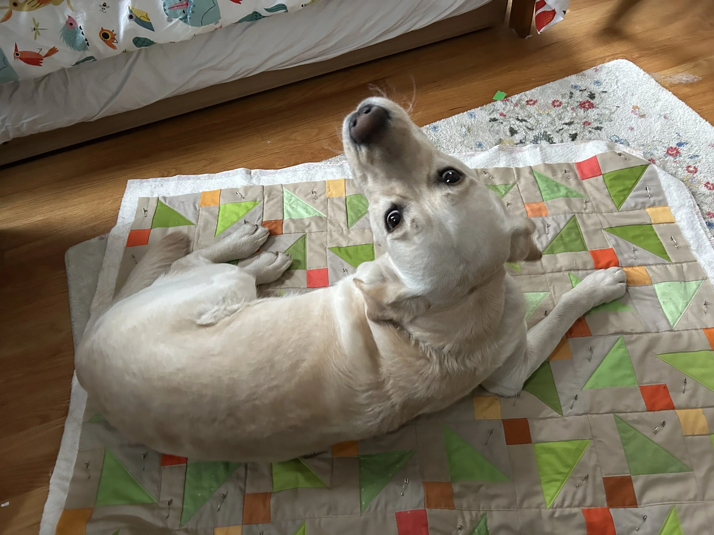 I cut the background block 11 inches square. Then I used a dog bowl to trace the circle for the head. (My compass wasn’t big enough to draw a circle large enough).