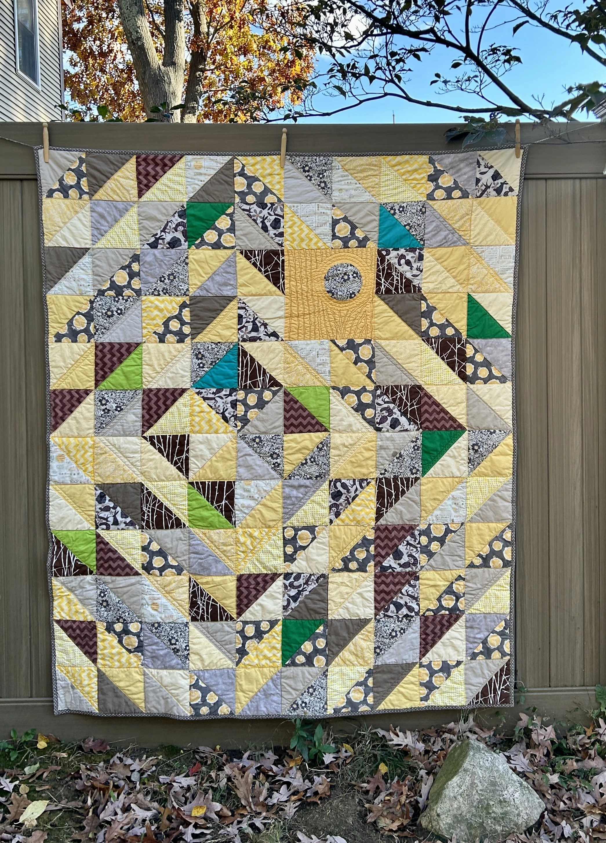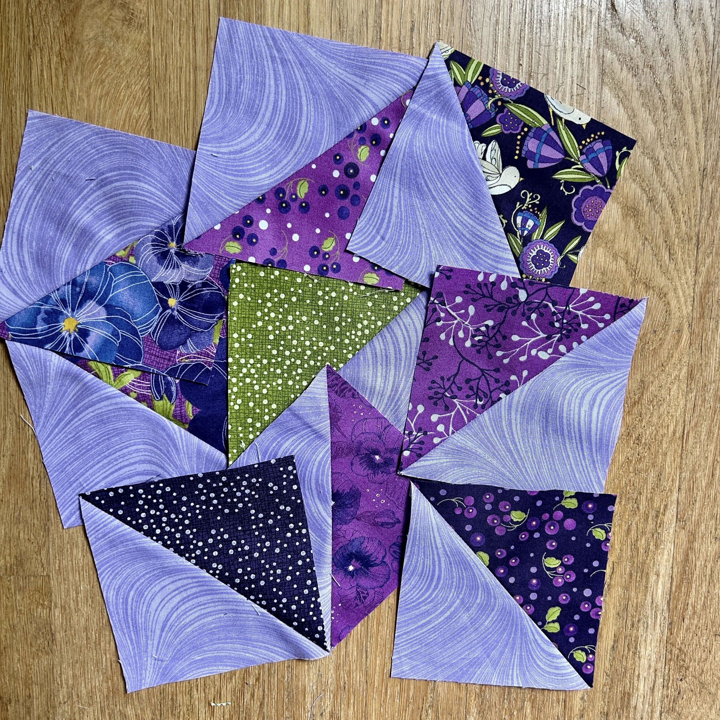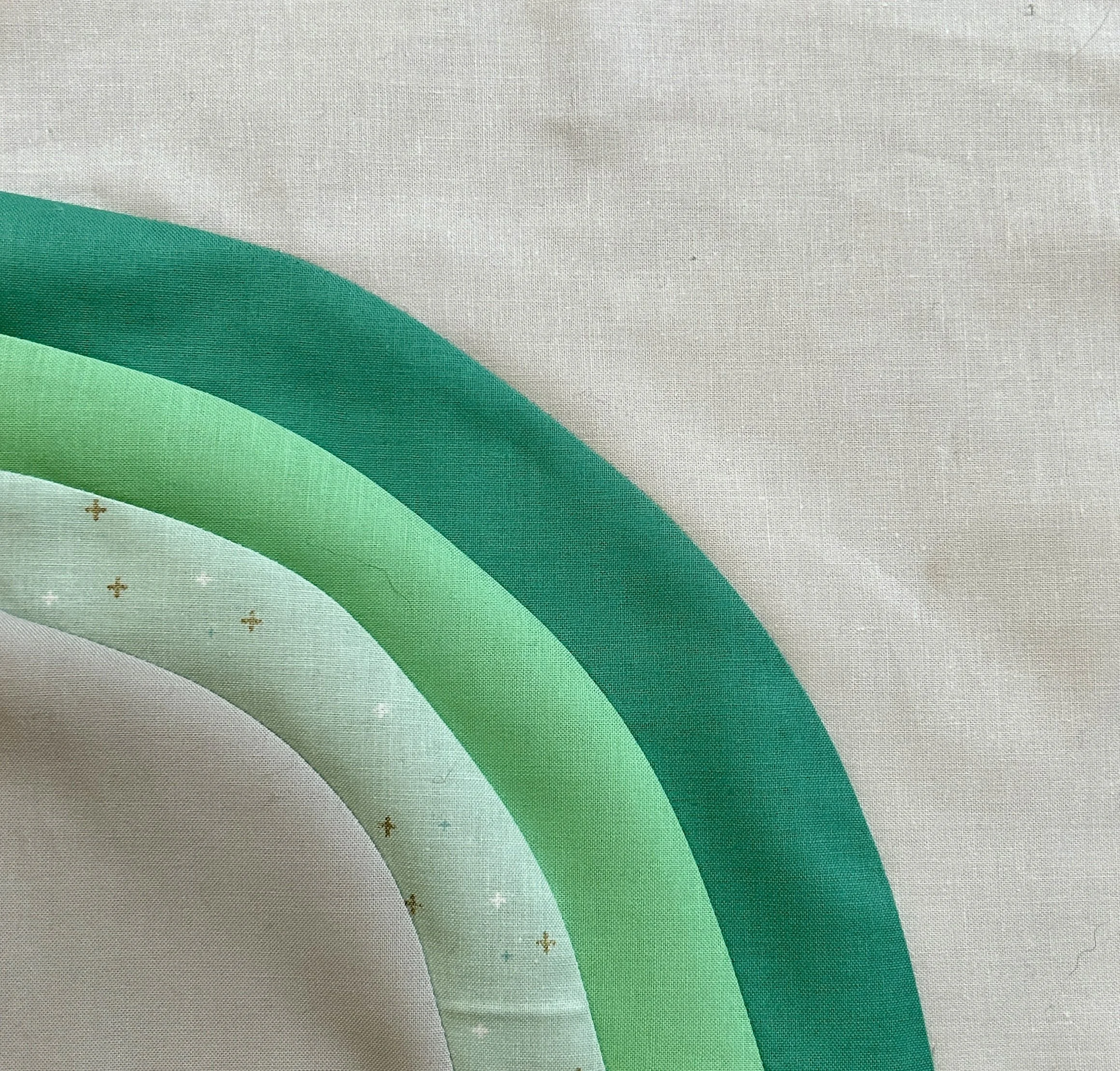 As much as I like a good full spectrum rainbow, I decided to do something calmer as there are 49 blocks in this project. That’s a lot of rainbows. So I decided to use green and yellow analogous colors with shades of grey.