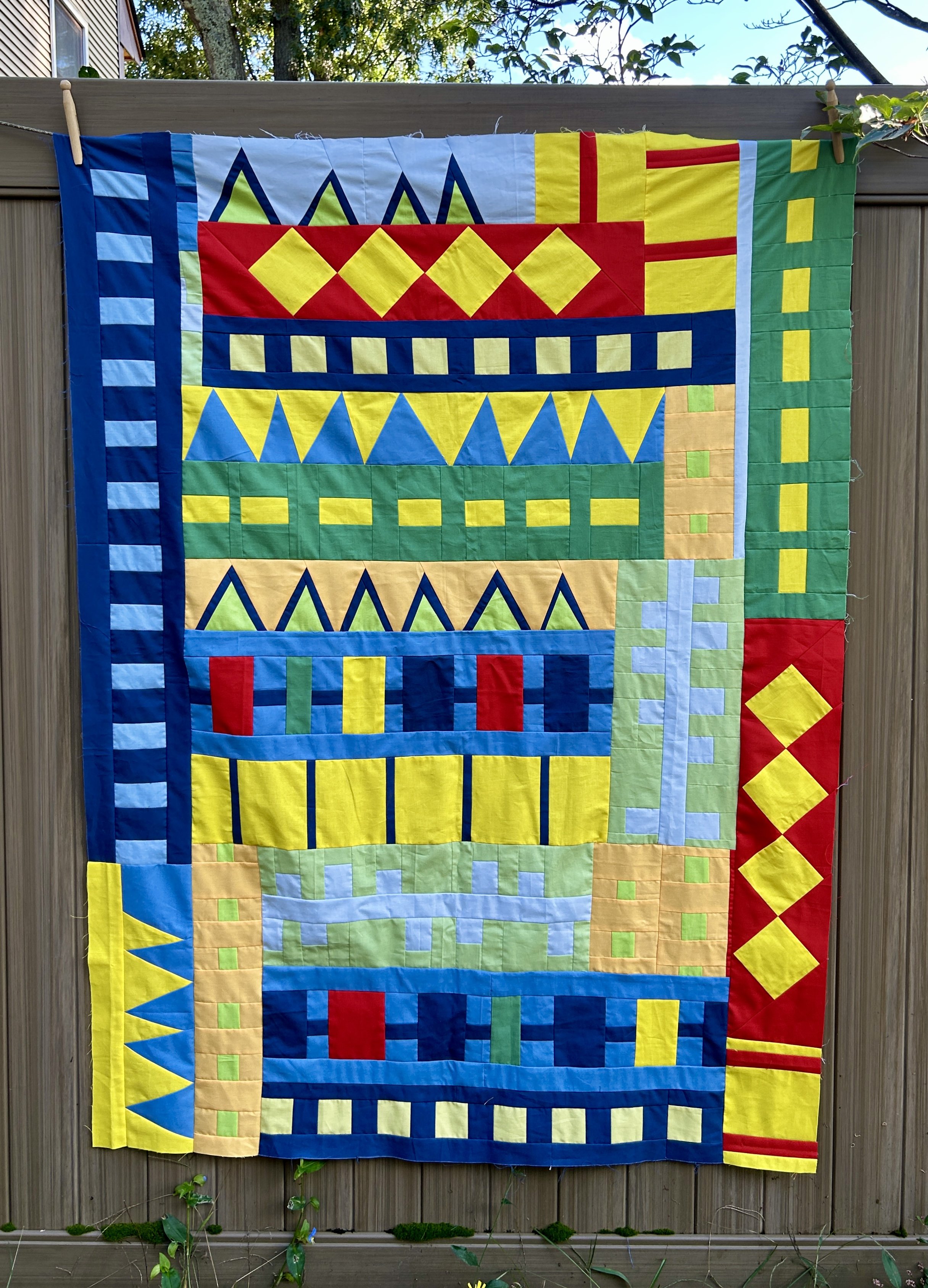 Wherever possible, I used scraps from the pieced blocks to fill in gaps between the strips. There are only 3 filler strips that weren’t part of the original blocks. The quilt is a tad wonky…not entirely a true rectangle. I could probably block it into a true shape by steam pressing the quilt top, but I didn’t make as a show quilt, so I’ll probably leave it as is.